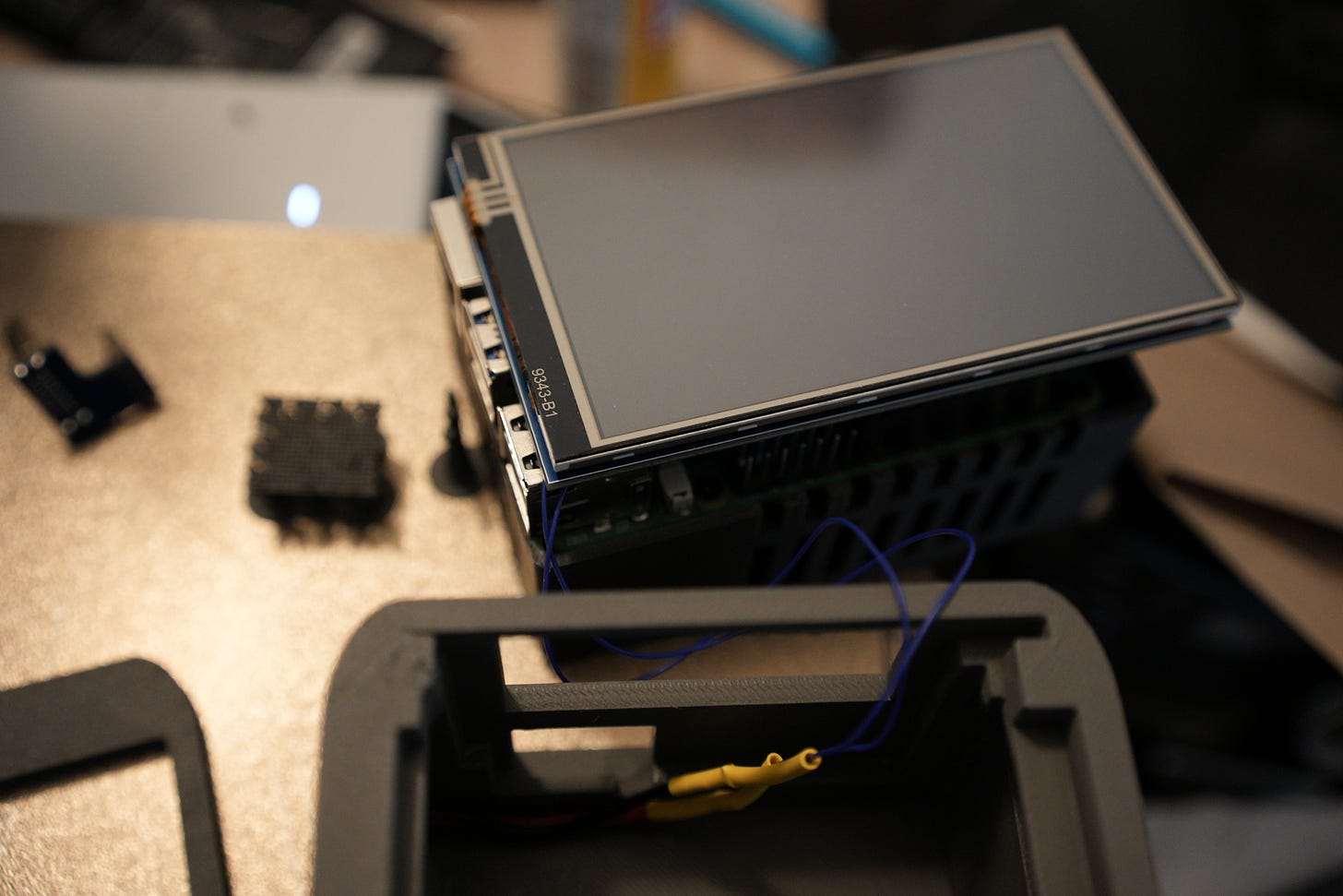 Attach ribbon to the Pi’s Cam0 port, then install the display.